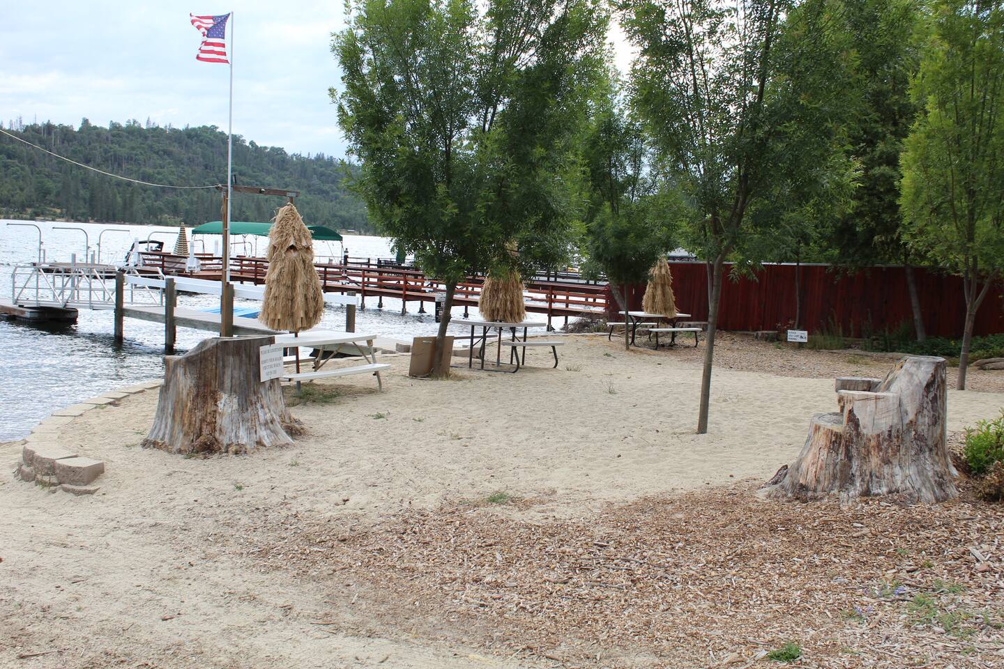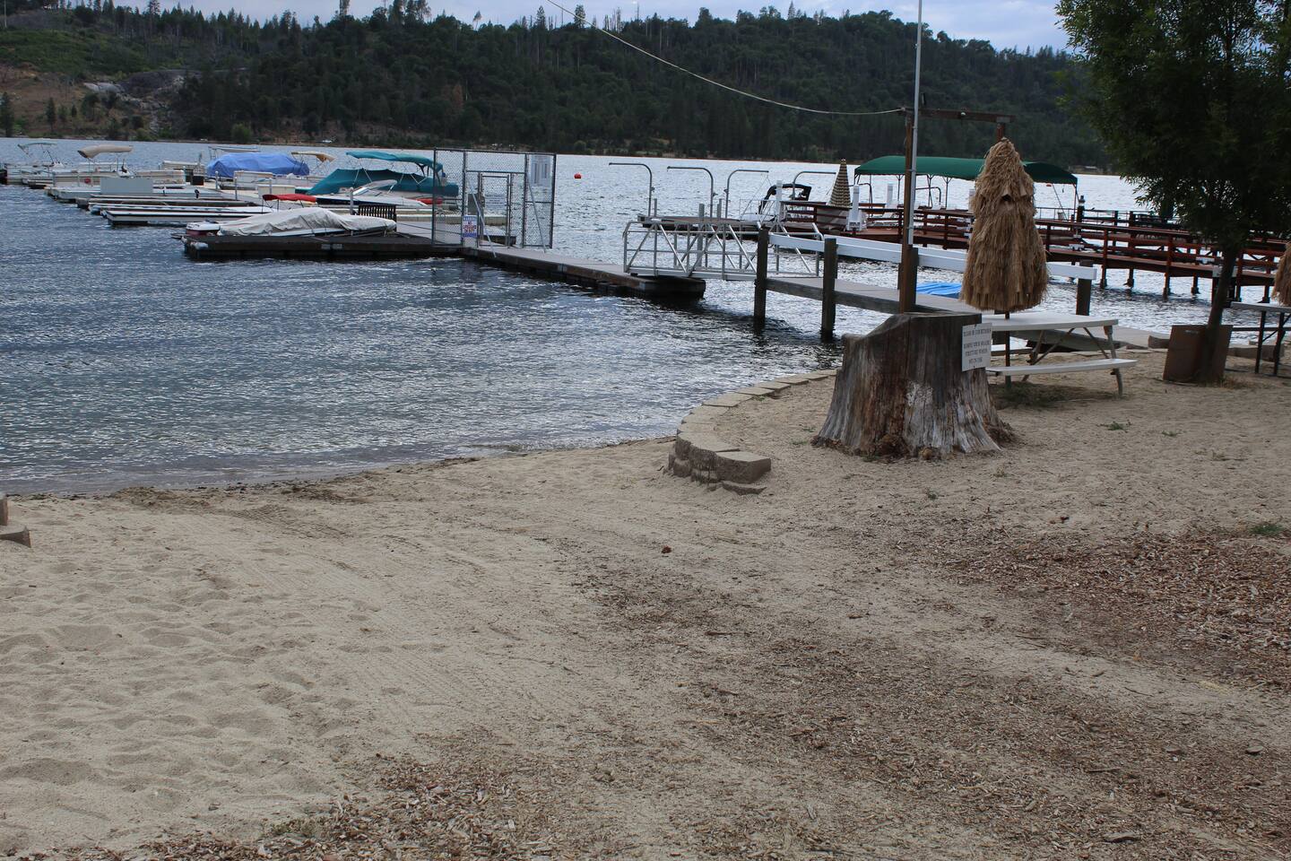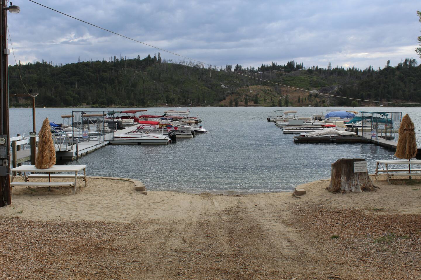 Unique vacation rental home in Bass Lake with boat slip in Brier Dock Association. The dock is a five-minute walk from the house. You can not swim off the dock, there is a small beach nearby with picnic tables. Max boat length is 24 feet for the boat slip. FREE WIFI, 3 BD, 3 BA with a living room, pool table in a converted garage, large living room with easy access to the well-appointed kitchen. This house is halfway between the popular Falls Beach and The Pines Resort. Boat Launch at the Pines.
