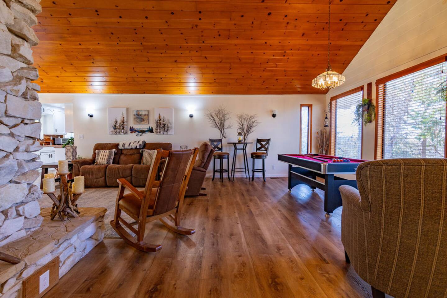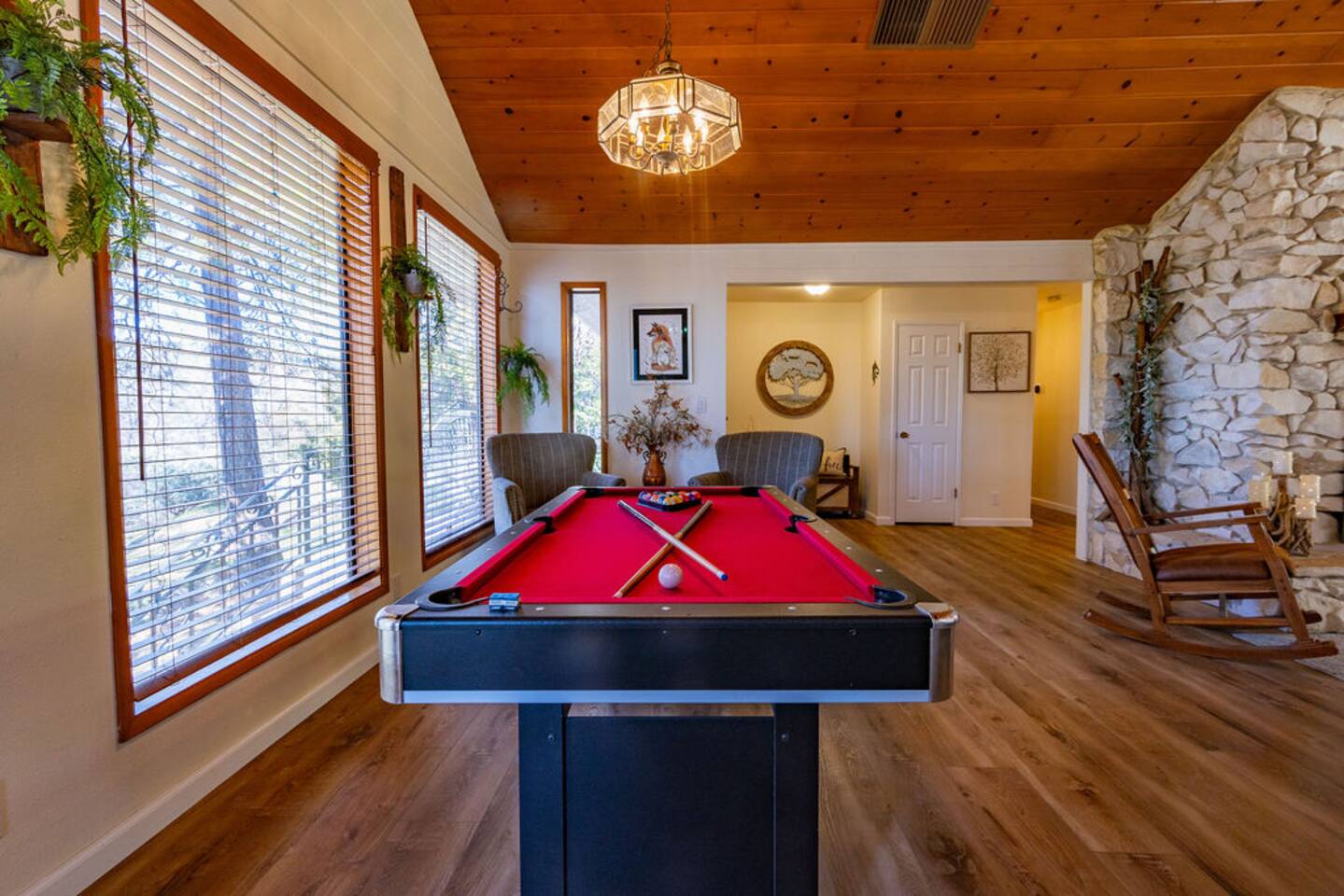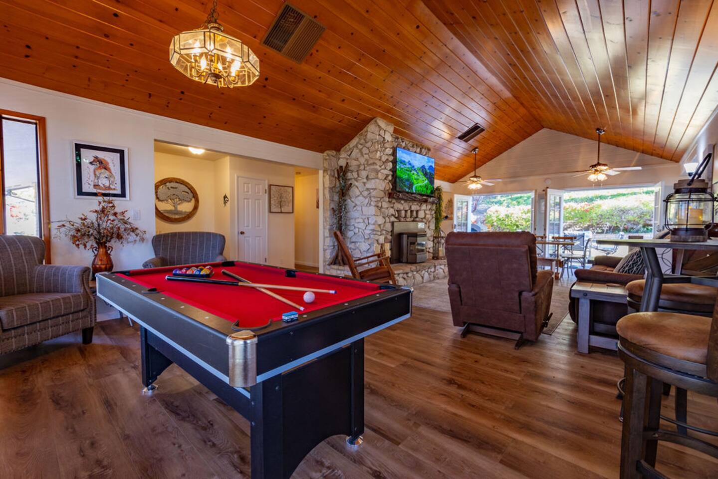 You will enjoy staying in this upscale house with a splash of country, surrounded by natural beauty. Plenty of room to spread out between the open floor plan, 4 bedrooms, and the French doors leading to the landscaped back yard. You can relax by the stove or play pool with friends. The neighborhood is lovely to walk in.